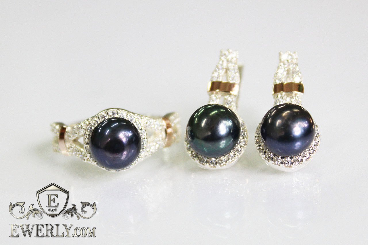 Комплект для женщин: серебряное кольцо и серьги с искусственным чёрным жемчугом и золотыми вставками. Серебро 925 пробы с золотом 375 пробы с фианитом чёрного цвета